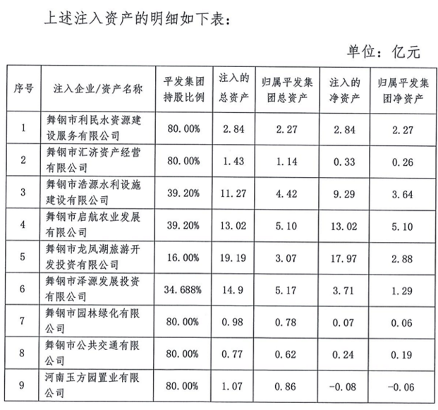 公告称,将舞钢市水利局持有的舞钢市利民水资源开发建设服务公司100%国有股权、舞钢市财政局持有的舞钢市汇济资产经营有限公司100%国有股权、舞钢市浩源水利设施建设有限公司49%国有股权、舞钢市启航农业发展有限公司49%国有股权、舞钢市龙凤湖旅游开发投资有限公司20%国有股权、舞钢市技改办持有的舞钢市泽源发展投资有限公司49%国有股权、舞钢市园林局持有的舞钢市园林绿化公司100%国有股权、舞钢市住建局持有的舞钢市公交公司100%国有股权、舞钢市房地产开发公司10%国有股权,合计总资产23亿元、净资产19.53亿元,无偿置入平发集团子公司舞钢市城乡开发建设投资有限公司;