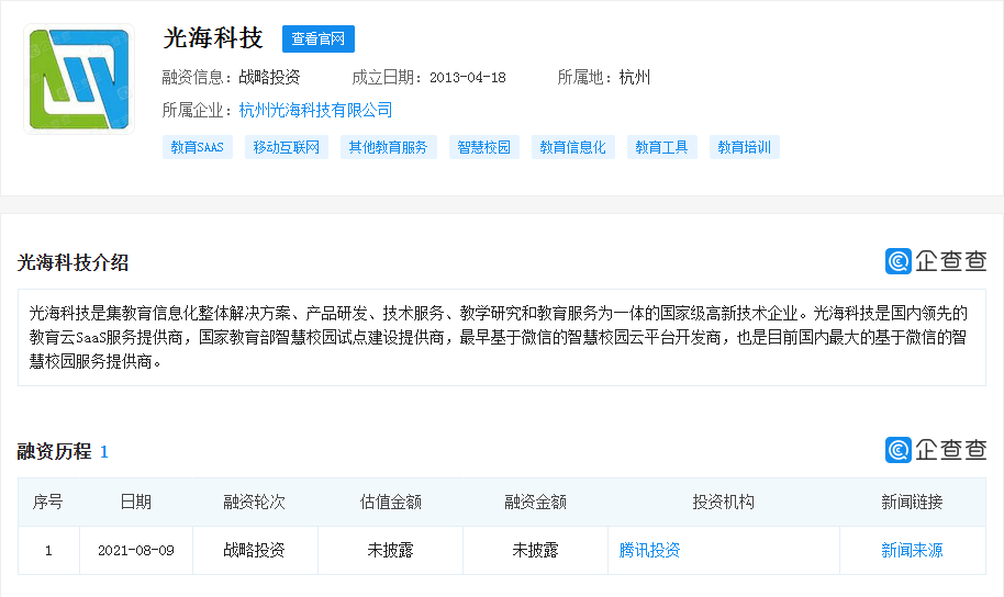 腾讯投资教育SaaS服务提供商光海科技